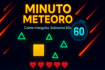 Arcade rápido de 60 segundos. Você controla um quadrado e precisa coletar o máximo de triângulos possível enquanto desvia da chuva de meteoros. Você começa com 5 vidas e ganha +1 vida a cada 10 triângulos coletados. Quando o tempo acaba ou as vidas chegam a zero, aparece a tela de fim com seu resultado.